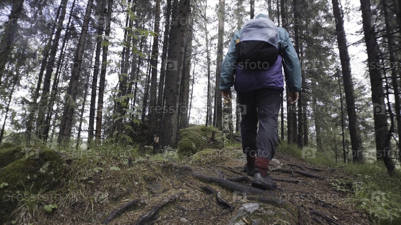 Вид сзади опытного пешехода со рюкзаком, поднимающегося по горе и исследующего естественную дикую среду