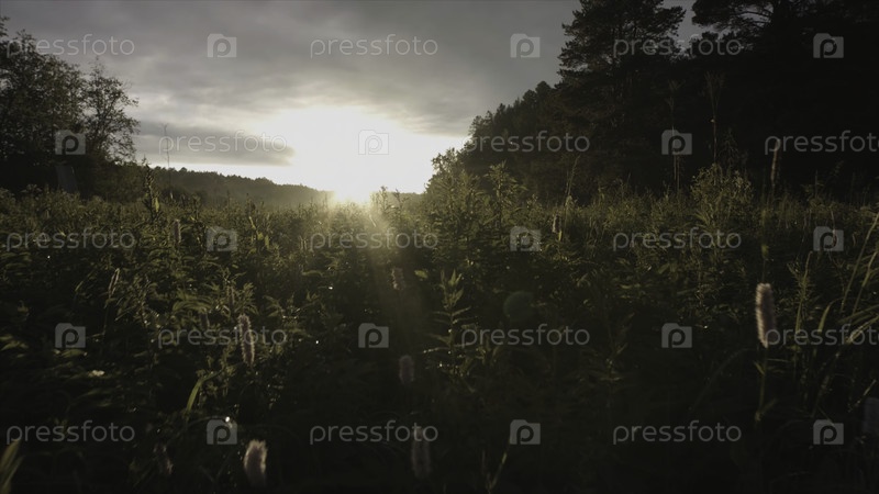 Красивая луга с дикими цветами качается на ветре над закатным небом фона. красота природы фоновое поле со солнечными вспышками