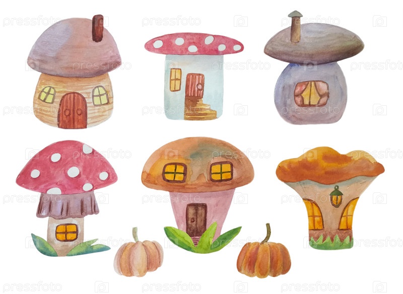 Набор домов клипарта в форме грибов и тыквен, изолированных на белом фоне. иллюстрация, нарисованная акварелью от руки