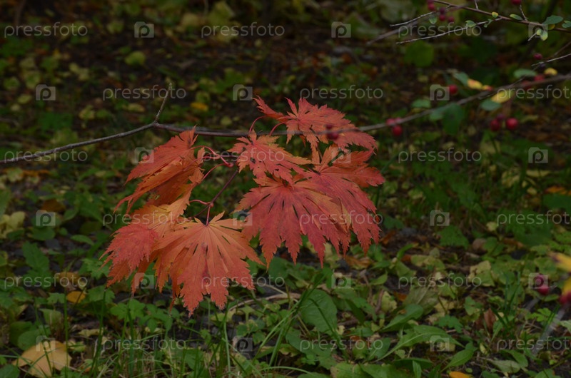 Кленовый японский аконитифолиум (Acer japonicum Aconitifolium) с красными осенними листьями в Ботаническом саду Петра Великого в Санкт-Петербурге