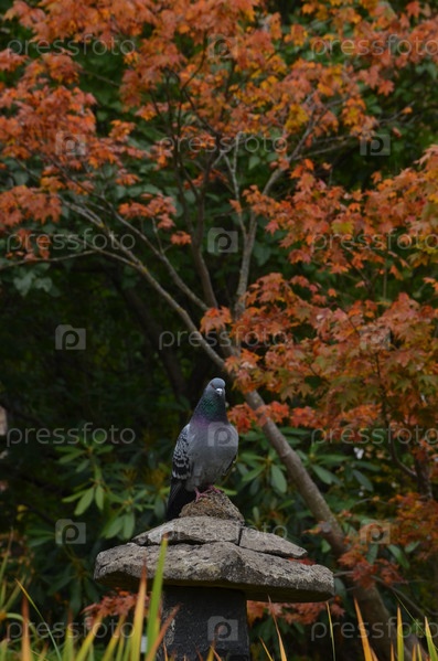 Голубой голубь сидит на японском садовом фонарике Торо среди яркой осенней листья Ботанического сада Петра Великого в Санкт-Петербурге