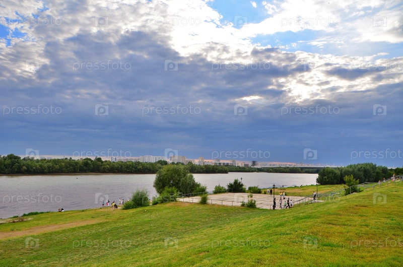 Вид на реку Иртыш в городе Омск и облачное небо