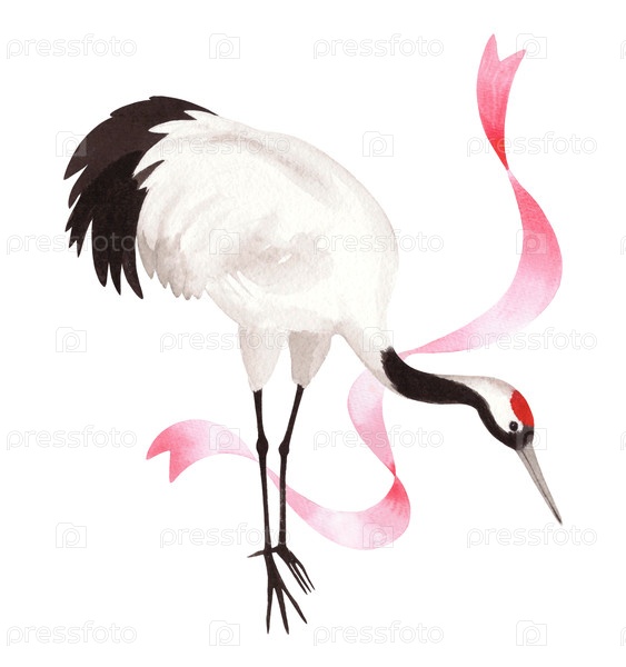Постоянный японский красный коронный кран и шелковая розовая лента. Иллюстрация ручной акварели. Нежные иллюстрации для ткани, обоев, поздравительных открыток, дизайна, декора и иллюстраций