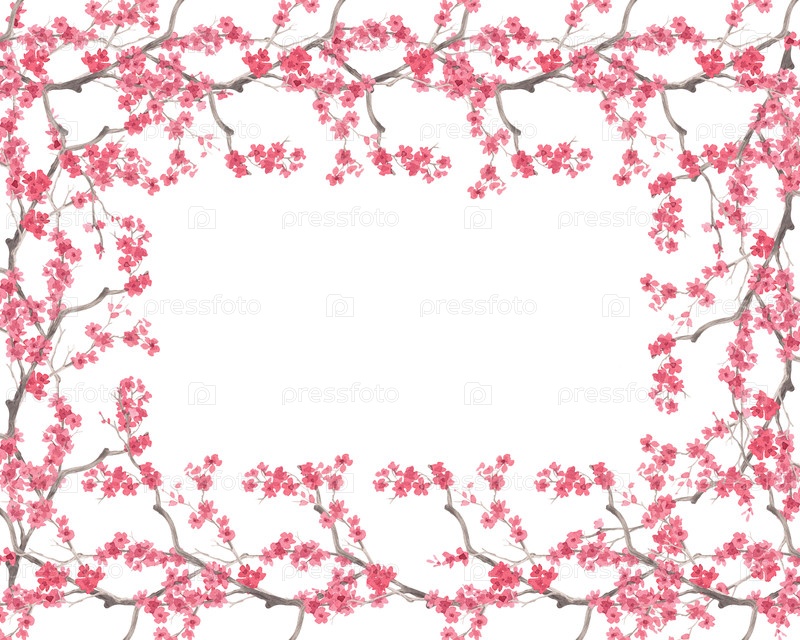 Реставрационная рама из вишневых ветвей. Иллюстрация ручной акварели. Для ткани, обоев, поздравительных открыток, дизайна, декора и иллюстрации