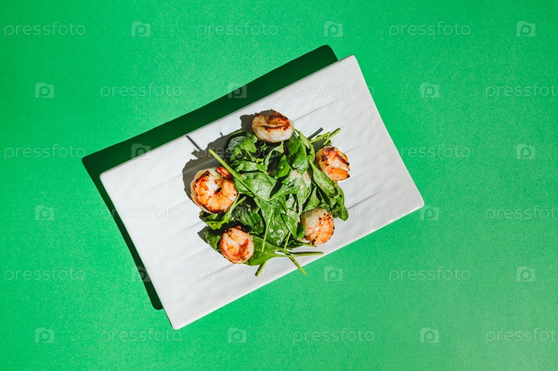 Салат с креветками и ругулой на белом блюде на цветном фоне
