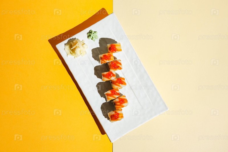 Рулоны суши с угорьем, креветками, огурцом и сливочным сыром, украшенные красным хайваром