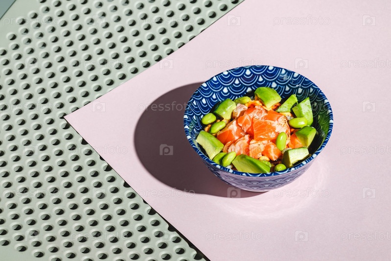 Встряхните миску с рисом, авокадо, бобами эдамаме и копченым лососем