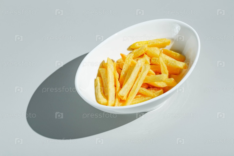 Фри в белой тарелке на светлом фоне