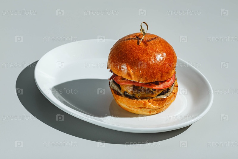 Апетит сочный бургер на белой тарелке на светлом фоне.Твердый свет, глубокая тень