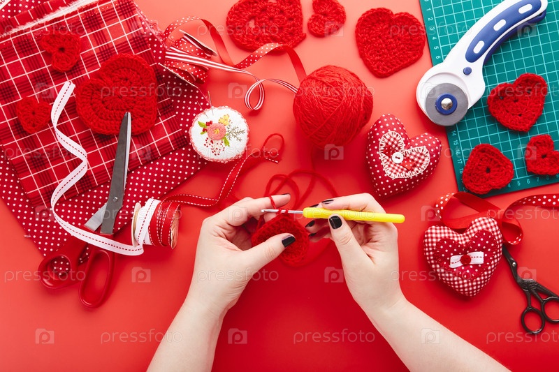 Вид сверху на материалы для шитья и вязания. День святого Валентина подарки ручной работы von