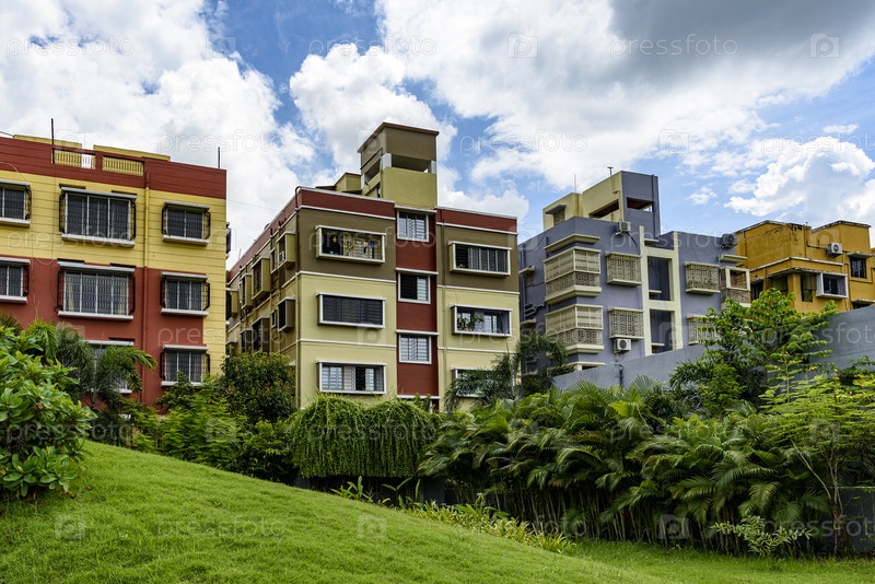 Яркие многоквартирные дома, окруженные пышной зеленью в Калькутте