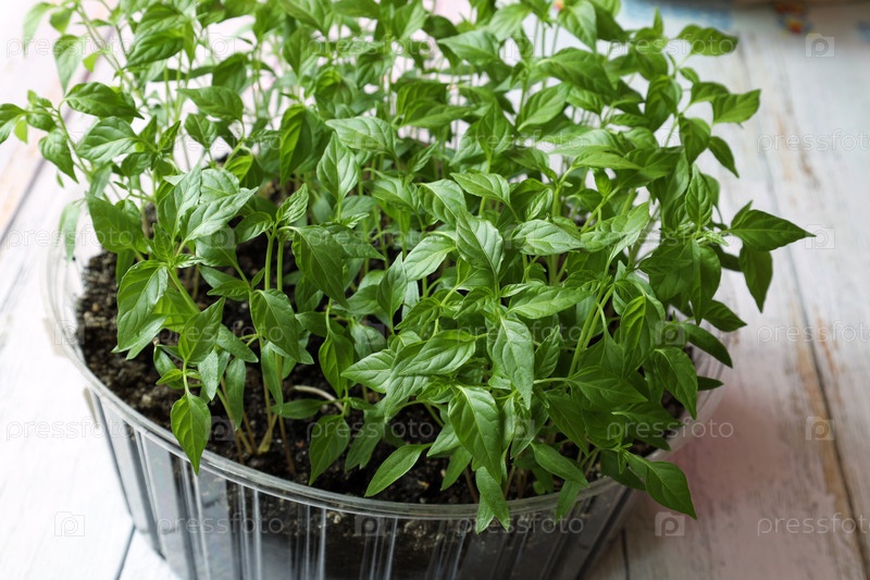 Саженцы перца растут в торфе в круглом пластиковом контейнере