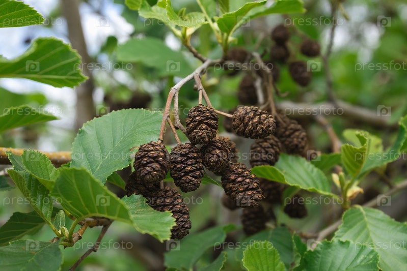 Плоды лиственничной эльды представляют собой маленькие коричневые конусы среди зеленых листьев на ветке