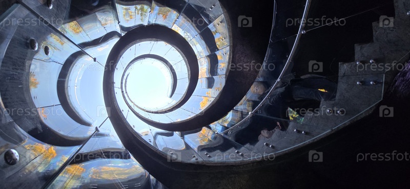 Красивая спиральная лестница, двойная. изготовлена из металла и стекла