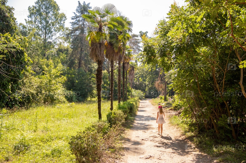 Девушка в красной шляпе и светлом платье идет по грунтовой дорожке в пышно-зеленом парке южных культур