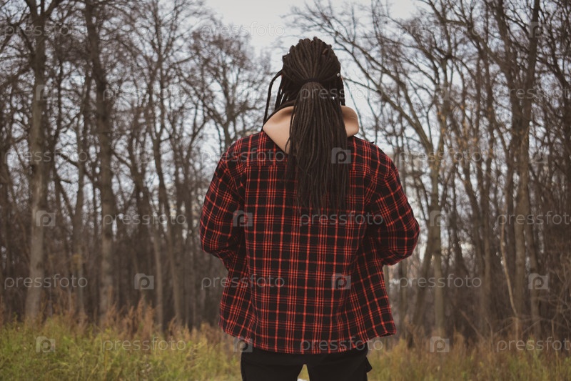 Парень с дредушками в квадратной рубашке в лесу