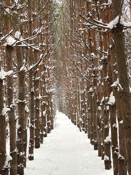 Зимний лес с тропой среди сосен