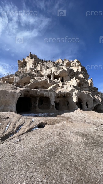 Древние пещеры в скалистом массиве под ярким небом