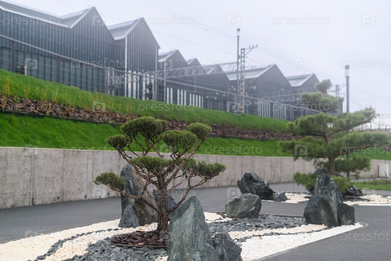 Дерево бонсай в саду с туманным городским пейзажем на заднем плане