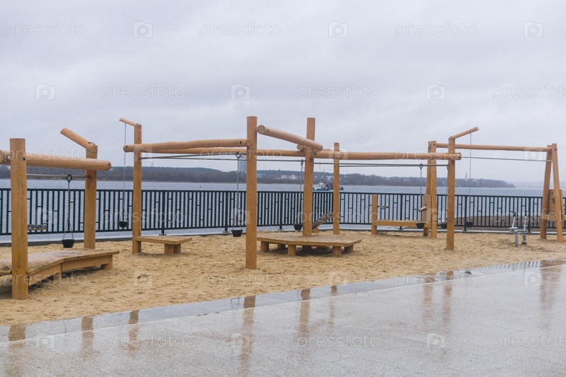 Деревянная игровая площадка на берегу озера в пасмурную погоду