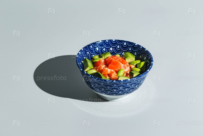 Встряхните миску с рисом, авокадо, бобами эдамаме и копченым лососем