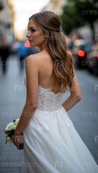 Невеста в белом платье и свободной причёске с небольшим букетом рук стоит за полворота на городской улице