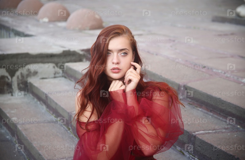 Молодая девушка сидит на лестнице в красном платье