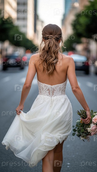 Невеста в платье и с букетом, держит край свадебного платья, идет по дороге