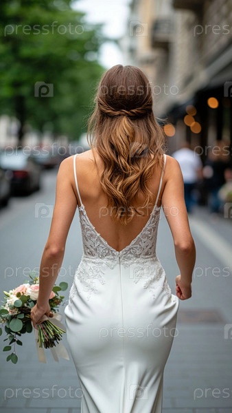 Невеста в элегантном белом платье гуляет/бегает по городской улице, задний вид