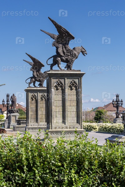 Скульптуры грифона с вытянутыми крыльями на каменном пьедестале в замке Гарибальди являются популярной туристической достопримечательностью в деревне Грящевка, Самаринская область, Россия