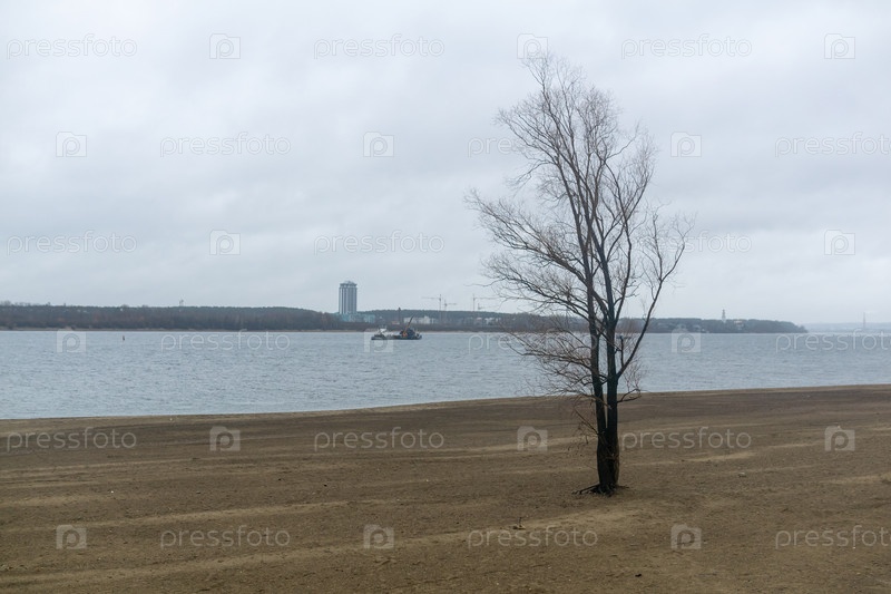 Одинокое дерево на берегу реки Камы в пасмурный день