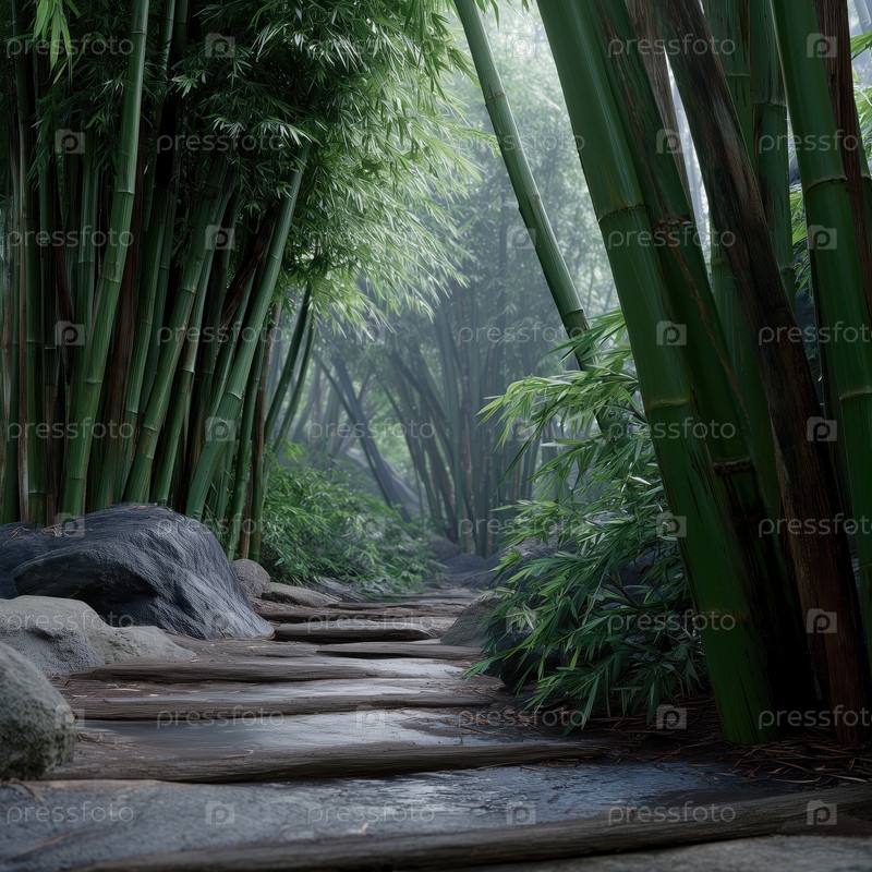 Тропа в горном бамбуковом лесу при туманной погоде