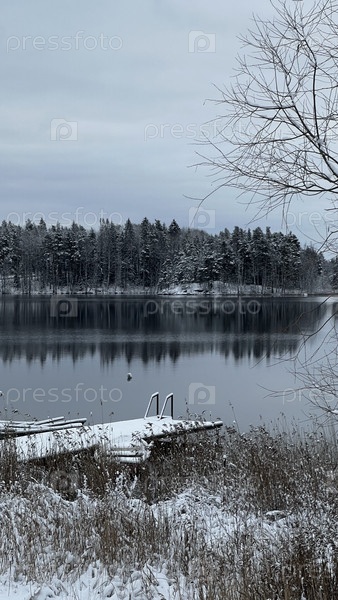 Заснеженный пирс на тихом лесном озере