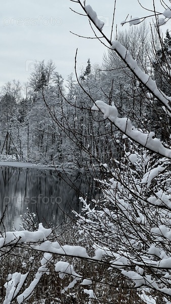 Снежный лес у озера зимой