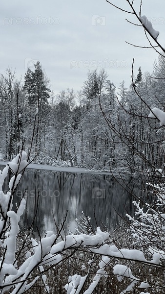 Снежный лес возле зимнего озера