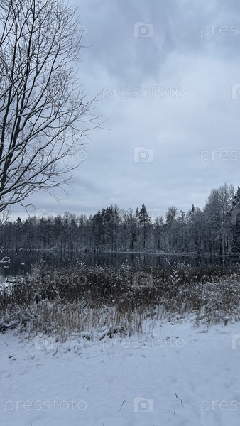 Заснеженный лес у замерзшего озера