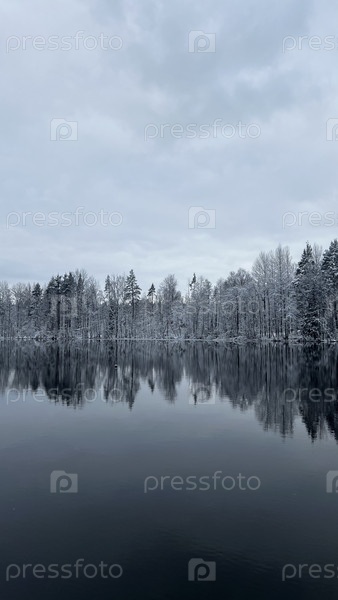 Снежный лес у спокойного озера