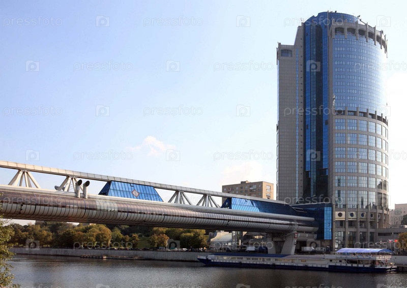 На изображении показаны торговый пешеходный мост Багратион и бизнес-центр Tower 2000 в Москве.Багратионский мост - первый объект Московского городского комплекса, открытый в 1997 году.Мост соединяет Краснопресненскую набережную с городом Москвой