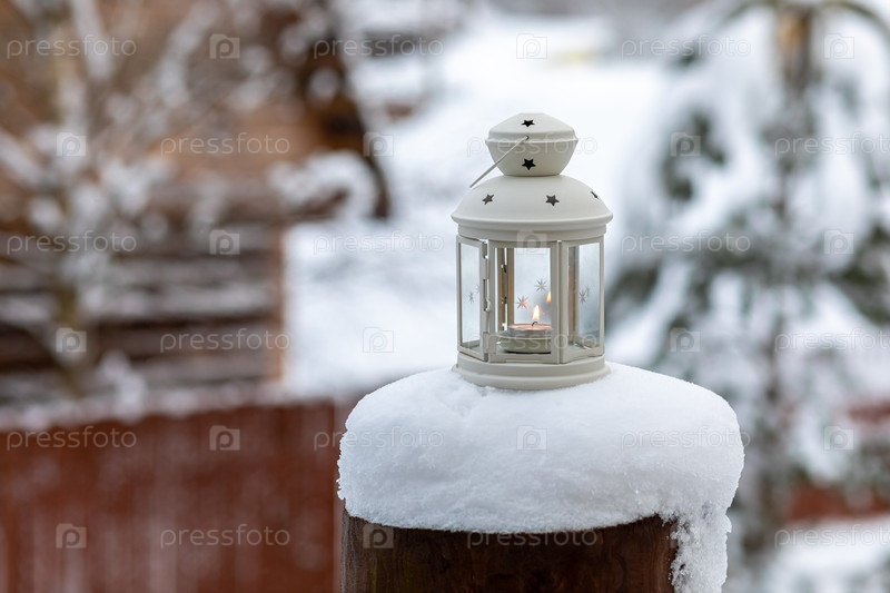 Винтажный фонарь с горящей свечой на покрытом снегом столбе в зимнем украшении деревенского двора