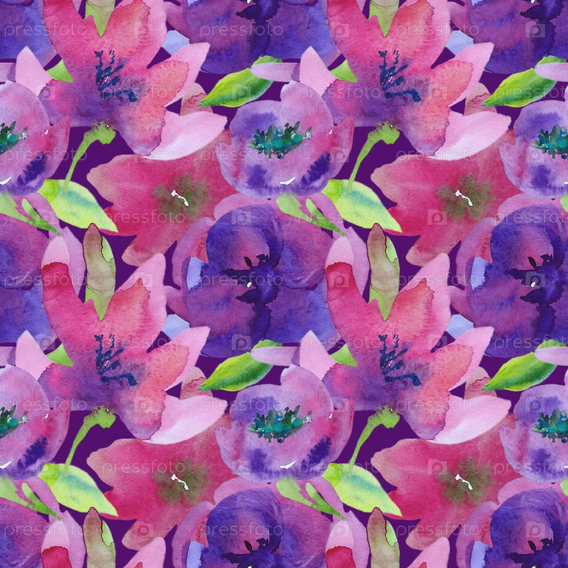 Бесшовный квадратный рисунок из розовых и фиолетовых цветов на пурпурном фоне. иллюстрация, нарисованная акварелью вручную