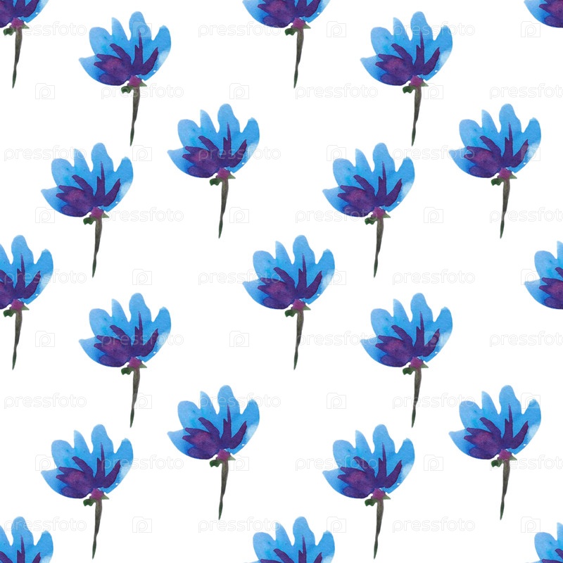 Бесшовный непрерывный рисунок, голубые цветы на белом фоне. Иллюстрация нарисована вручную в стиле свободной акварели. Цветочный рисунок на ткани, обоях, крышках, упаковке