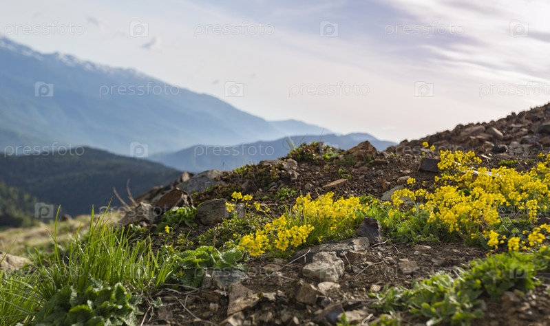 Горный пейзаж.Желтые цветы на фоне гор