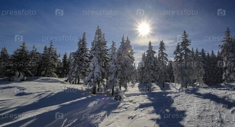 Зимний пейзаж.Конусовый лес в снегу зимнего солнечного дня