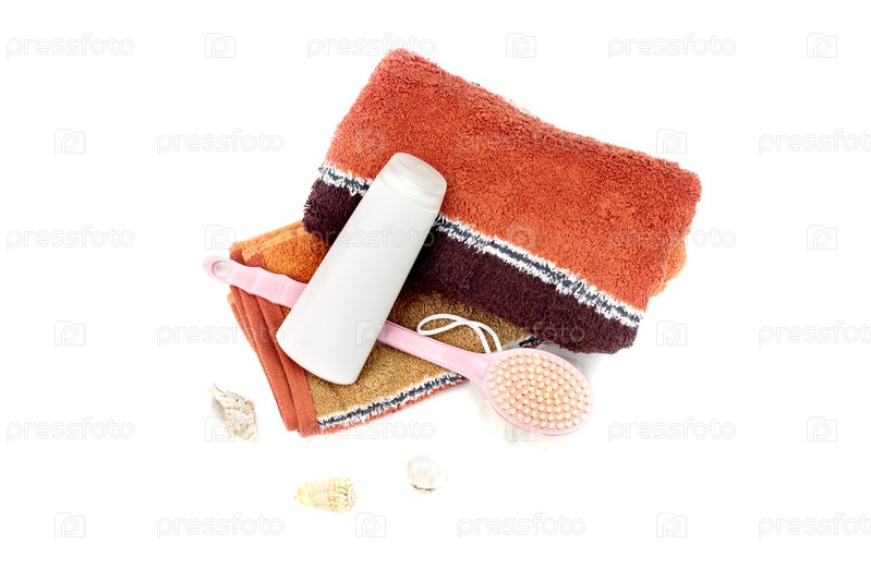 Два полотенца, шампунь и тряпка с ручкой на белом фоне