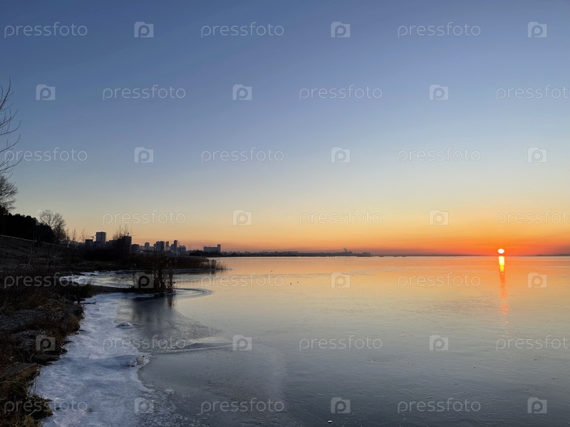 Закат солнца над замерзшей рекой Кама в городе Набережные Челны, Россия
