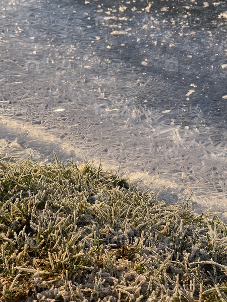 Макрофотосъемка замерзшей травы возле замороженной реки