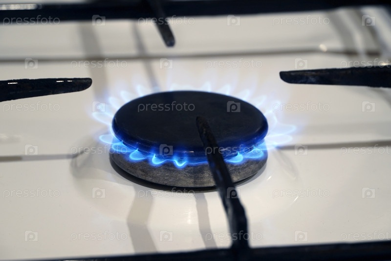 Кухонная плита на газовом горелке с синим пламенем в ближайшем плане