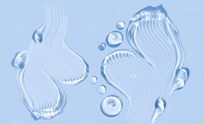 Чисто прозрачные косметические гелевые капли и тампоны на синем фоне, текстура глицерина для ухода за кожей. top view