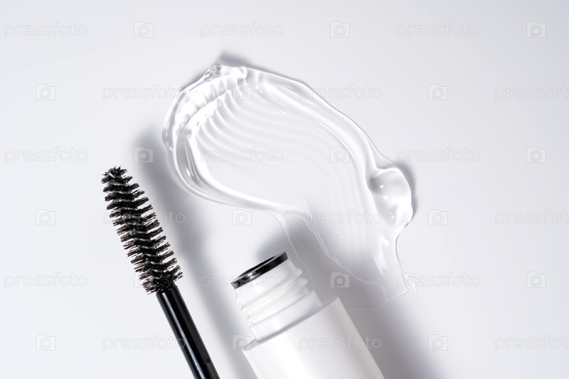 Прозрачная цилиарная брови или гелевая сыворотка, с черной щеткой на белом фоне. гладкое и блестящее представление текстуры