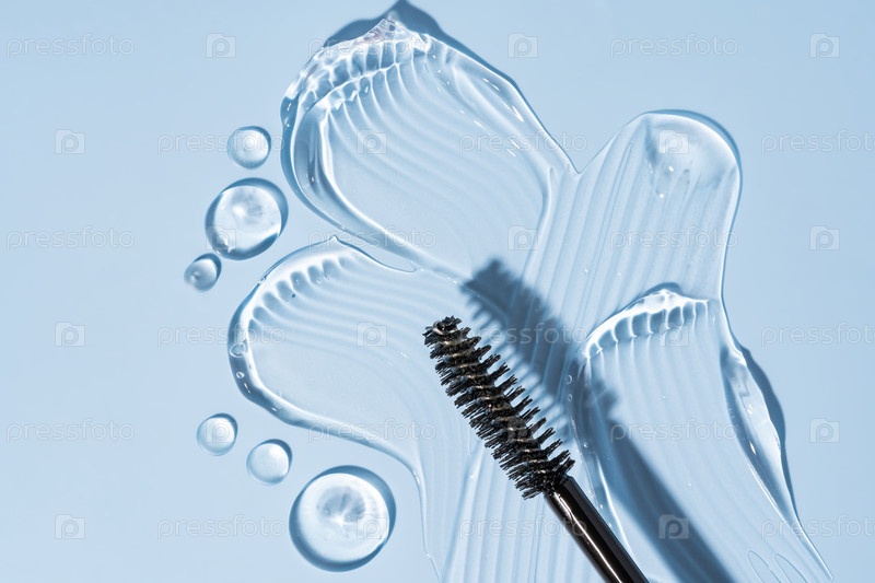 Близкий прозрачный ресница или гель для бровей с черной щеткой, гладкая и блестящая текстура на синем фоне